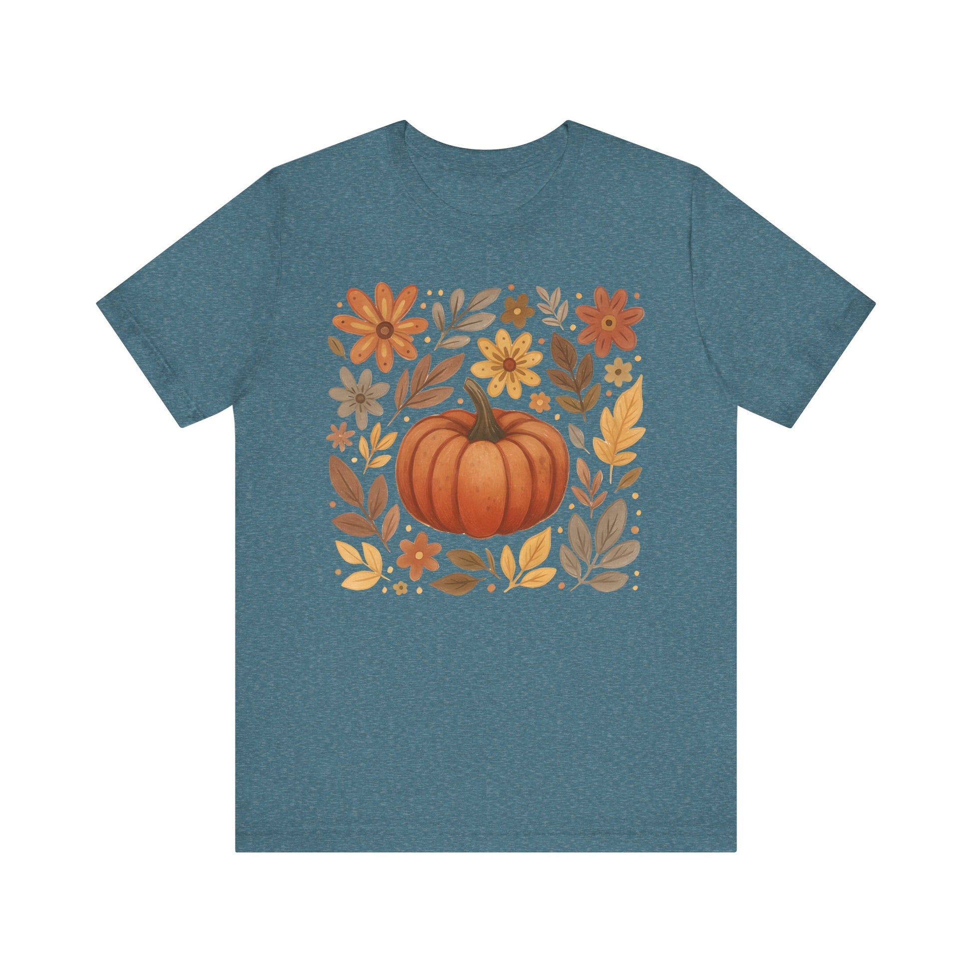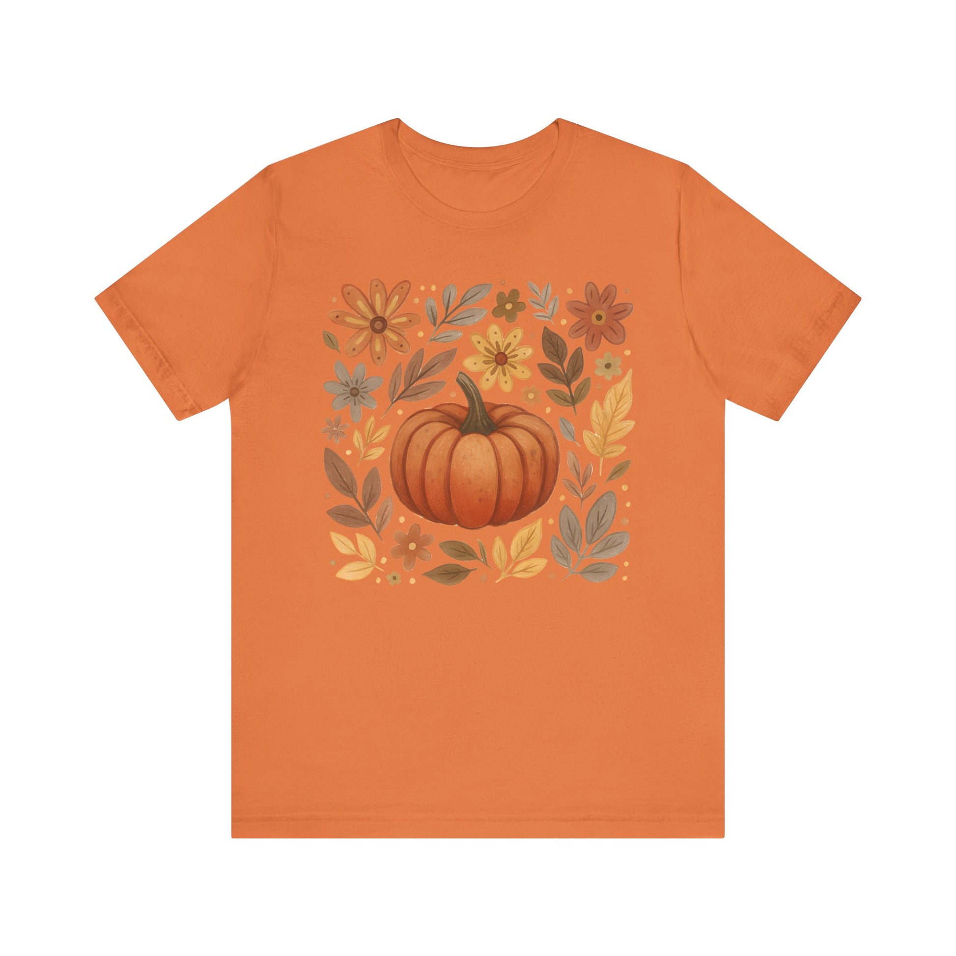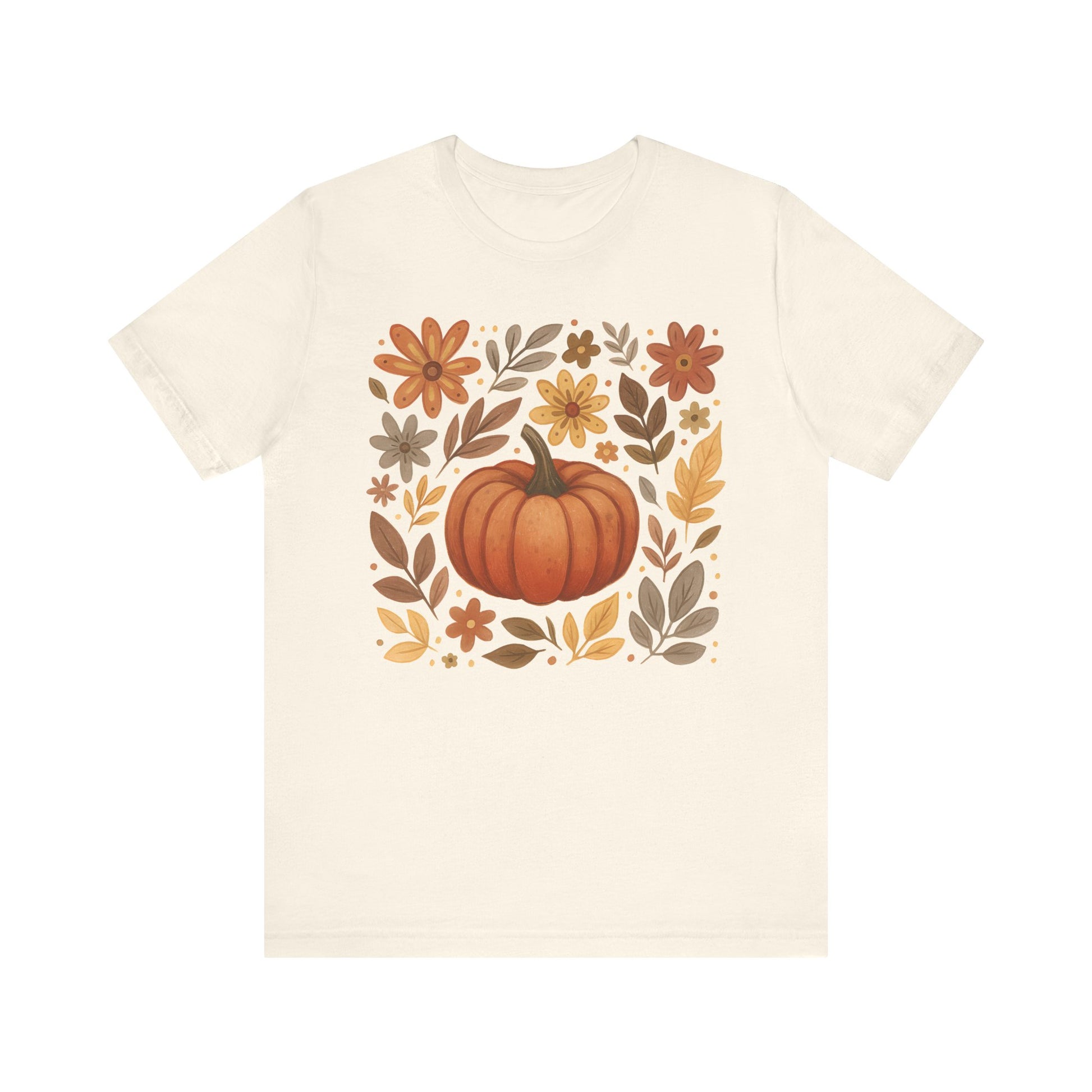 Introducing a stylish Unisex Jersey Short Sleeve Tee that brings warmth and charm to your wardrobe. This tee features a beautiful pumpkin design surrounded by autumn leaves and flowers, perfect for celebrating the cozy vibes of fall. Made from 100% Airlume combed and ring-spun cotton, this lightweight shirt is ideal for casual outings or layering during transitional weather. Whether you're sipping pumpkin spice lattes at a cozy café or attending festive gatherings, this tee is a comfy and fashionable choice. It's perfect for adults who cherish seasonal celebrations, Thanksgiving gatherings, and cozy autumn events, making it a must-have addition to your fall attire.