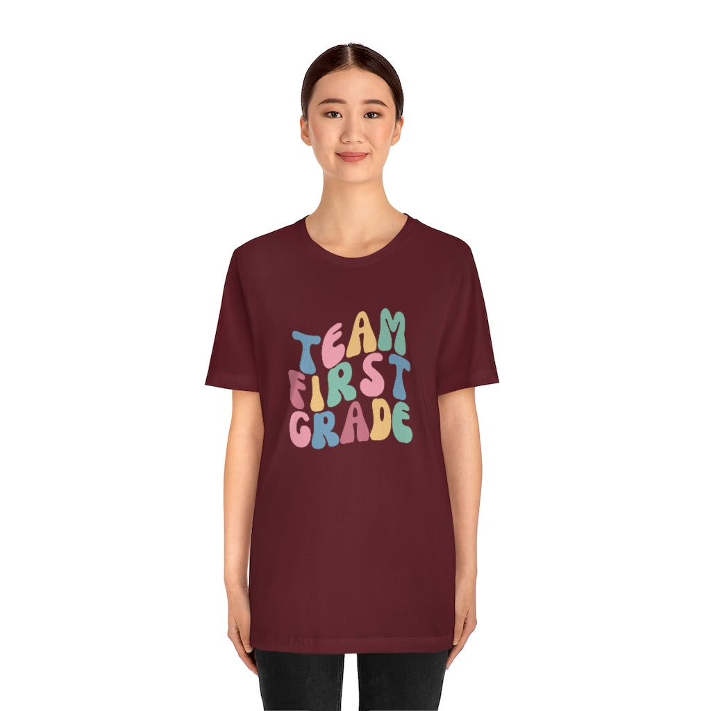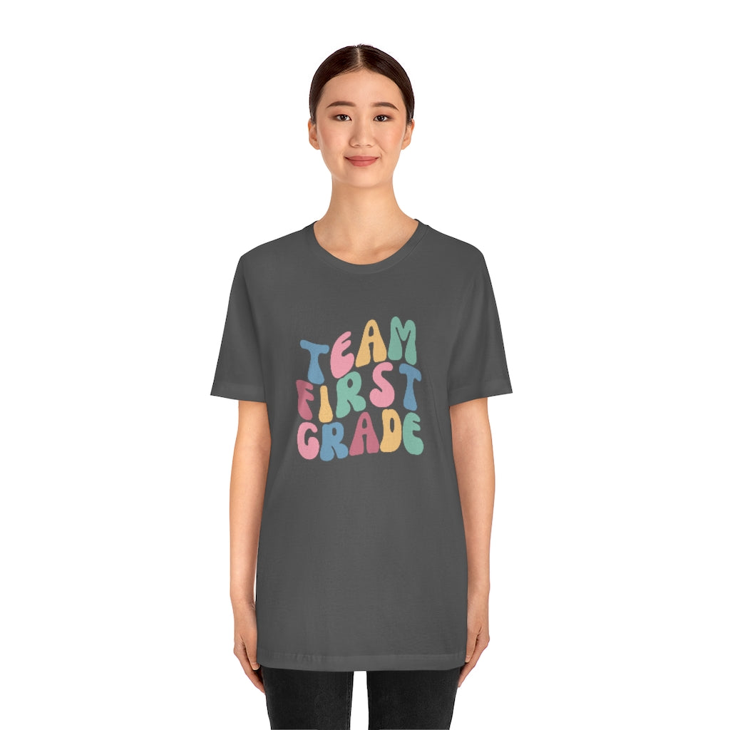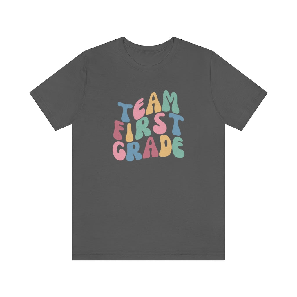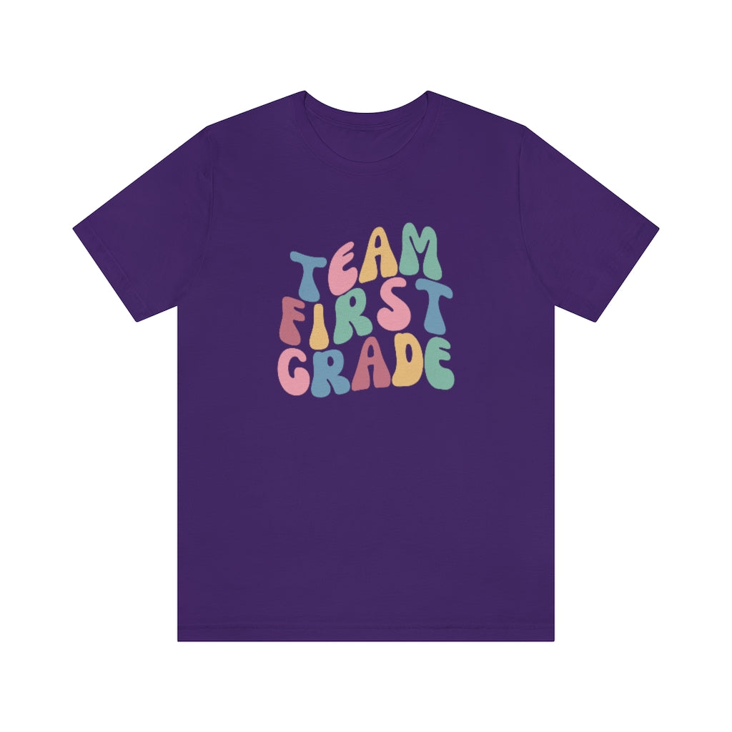 Show your Team First Grade pride in this lightweight, retro print tee! Our high quality Bella + Canvas unisex tees are the perfect combination of style and comfort. Made to last, this tee will be with you for all the early mornings, conferences, late nights and anything in between. Available in purple, white, black and asphalt gray.